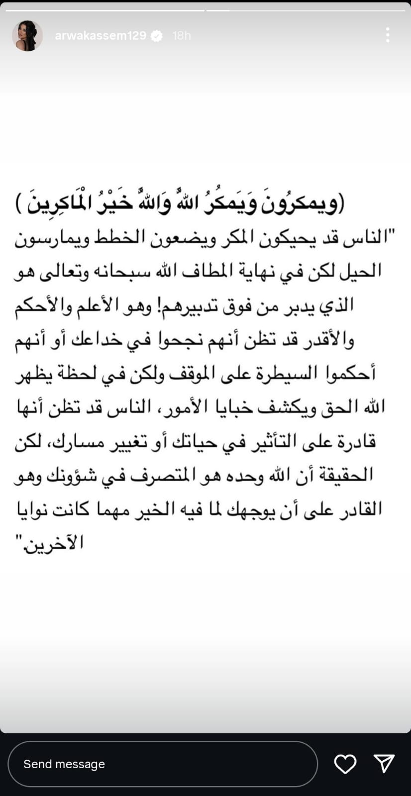 وفي رسالة آخرى، كتبت أروى قاسم: (ويمكرون ويمكر الله والله خير الماكرين).. الناس قد يحيكون المكر ويضعون الخطط ويمارسون الحيل لكن في نهاية المطاف الله سبحانه وتعالى هو الذي يدير من فوق تدبيرهم! وهو الأعلم والأحكم والأقدر، قد تظن أنهم نجحوا في خداعك أو أنهم أحكموا السيطرة على الموقف ولكن في لحظة يظهر الله الحق ويكشف خبايا الأمور.