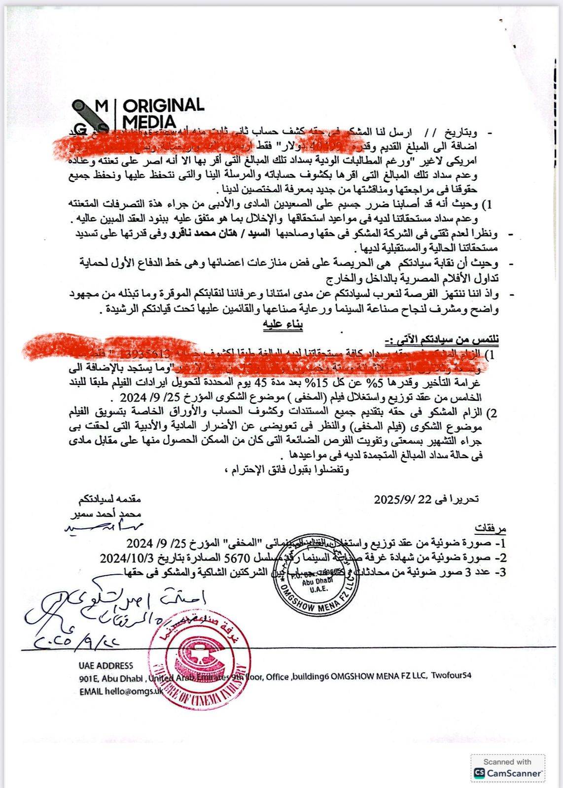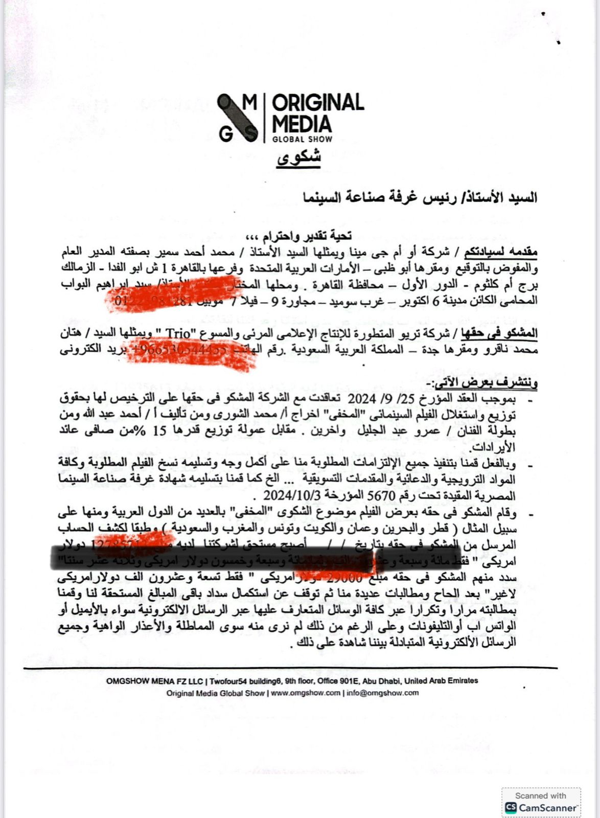 وأكدت الشركة، التي تتخذ من أبوظبي مقرًا لها ويمثلها المنتج محمد أحمد سمير، أنها اضطرت إلى إرسال إنذار رسمي لشركة "تريو" وممثلها هتان ناقرو، كما تقدمت بشكوى رسمية إلى غرفة صناعة السينما لدعم مطالبها والحصول على حقوقها المشروعة.