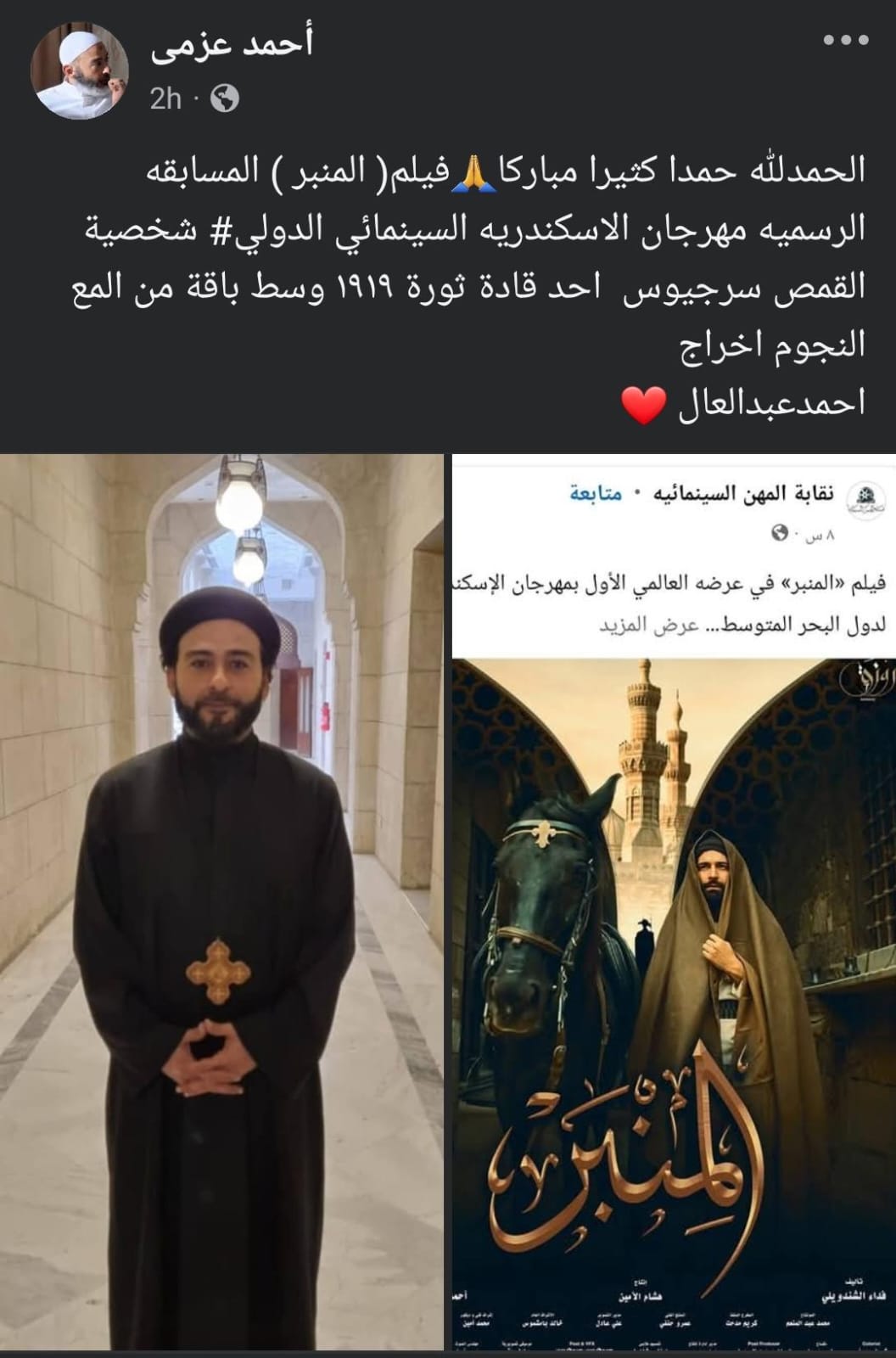 وكتب أحمد عزمي، علي صفحته الشخصية بموقع فيسبوك: “الحمد لله حمدا كثيرا مباركا، فيلم المنبر المسابقة الرسمية لمهرجان الإسكندرية السينمائي الدولي، شخصية القمص سرجيوس أحد قادة ثورة 1919 وسط باقة من ألمع النجوم، إخراج أحمد عبد العال”.