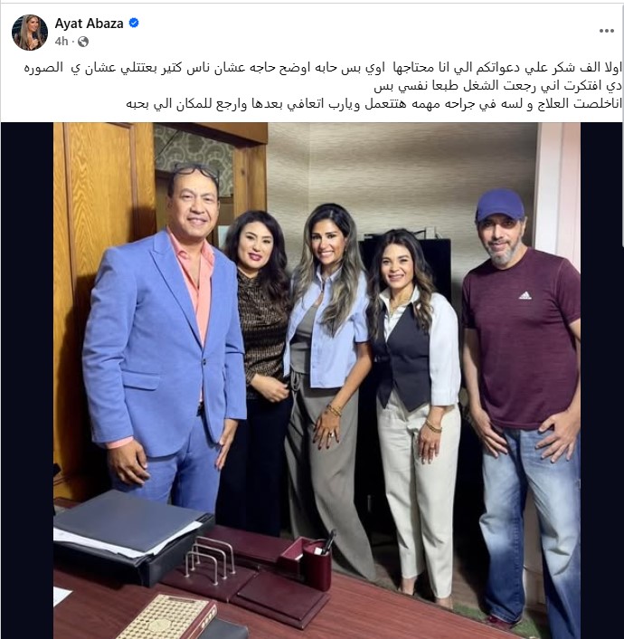 وكتبت آيات أباظة من خالال حسابها الرسمي عبر موقع التواصل الاجتماعي فيسبوك، قالت: "أولًا الف شكر علي دعواتكم الي انا محتاجها اوي بس حابه اوضح حاجه عشان ناس كتير بعتتلي عشان ي الصوره دي افتكرت اني رجعت الشغل طبعا نفسي بس.. انا خلصت العلاج و لسه في جراحه مهمه هتتعمل ويارب اتعافي بعدها وارجع للمكان الي بحبه".