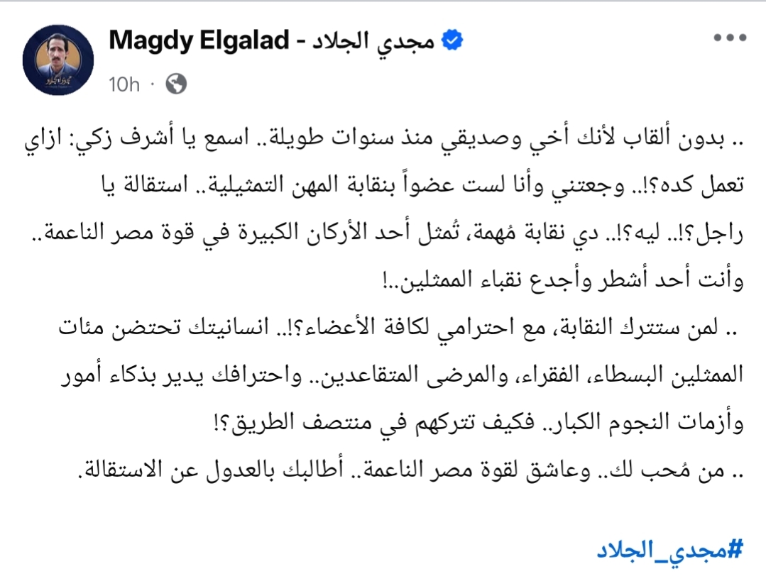 وجّه الكاتب الصحفي مجدي الجلاد، رسالة إلى صديقه الدكتور أشرف زكي، وذلك بعد إعلان الأخير قراره بترك منصبه كنقيب للمهن التمثيلية.