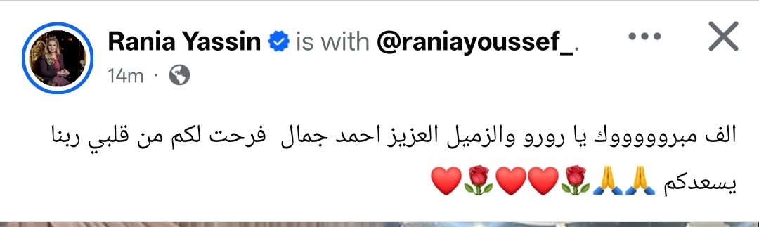 وكتبت رانيا محمود ياسين من خلال حسابها الرسمي عبر موقع التواصل الاجتماعي فيسبوك، قالت: "ألف مبروك يا رورو والزميل العزيز أحمد جمال.. فرحت لكم من قلبي ربنا يسعدكم".