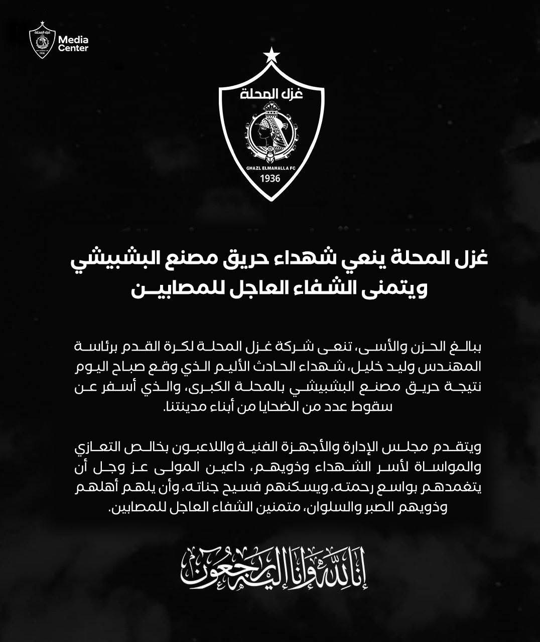 وأصدر نادي غزل المحلة لكرة القدم بيانًا رسميًا جاء فيه:"ببالغ الحزن والأسى، تنعى شركة غزل المحلة لكرة القدم برئاسة المهندس وليد خليل، شهداء الحادث الأليم الذي وقع صباح اليوم نتيجة حريق مصنع البشبيشي بالمحلة الكبرى، والذي أسفر عن سقوط عدد من الضحايا من أبناء مدينتنا.