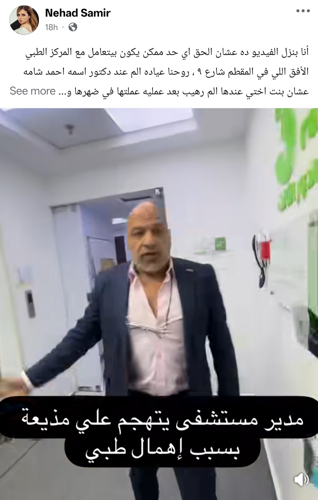 نشرت الإعلامية نهاد سمير مقدمة برنامج "صباح البلد" عبر حسابها الشخصي على موقع التواصل الاجتماعى فيس بوك مقطع فيديو يوثق لحظة تعدي مدير مركز طبي بالمقطم عليها، أثناء محاولتها تصوير واقعة إهمال طبي تعرضت لها ابنة شقيقتها داخل المركز.