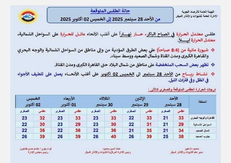 توقعت الهيئة أن يسود طقس معتدل الحرارة في الصباح الباكر، وحار نهارًا على أغلب أنحاء الجمهورية، بينما يكون الطقس مائلًا للحرارة على السواحل الشمالية، ومعتدل الحرارة ليلًا على مختلف المناطق.