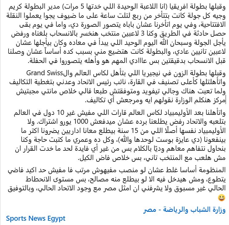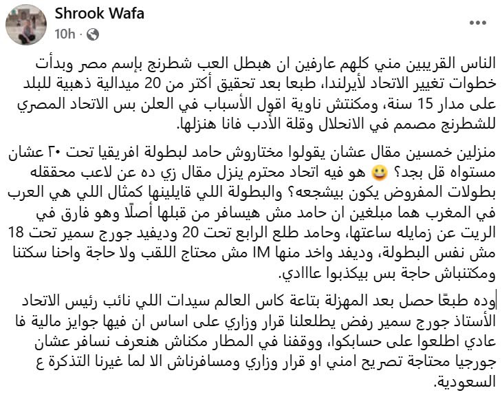 وجاء القرار بعد أن نشرت شروق وفا منشورًا هاجمت خلاله مسؤولي الاتحاد المصري للشطرنج ووجهت لهم مجموعة من الاتهامات، متضمنًا عبارات مثل: “لا يشرفني أن أمثل مصر مع وجود الاتحاد الحالي”.