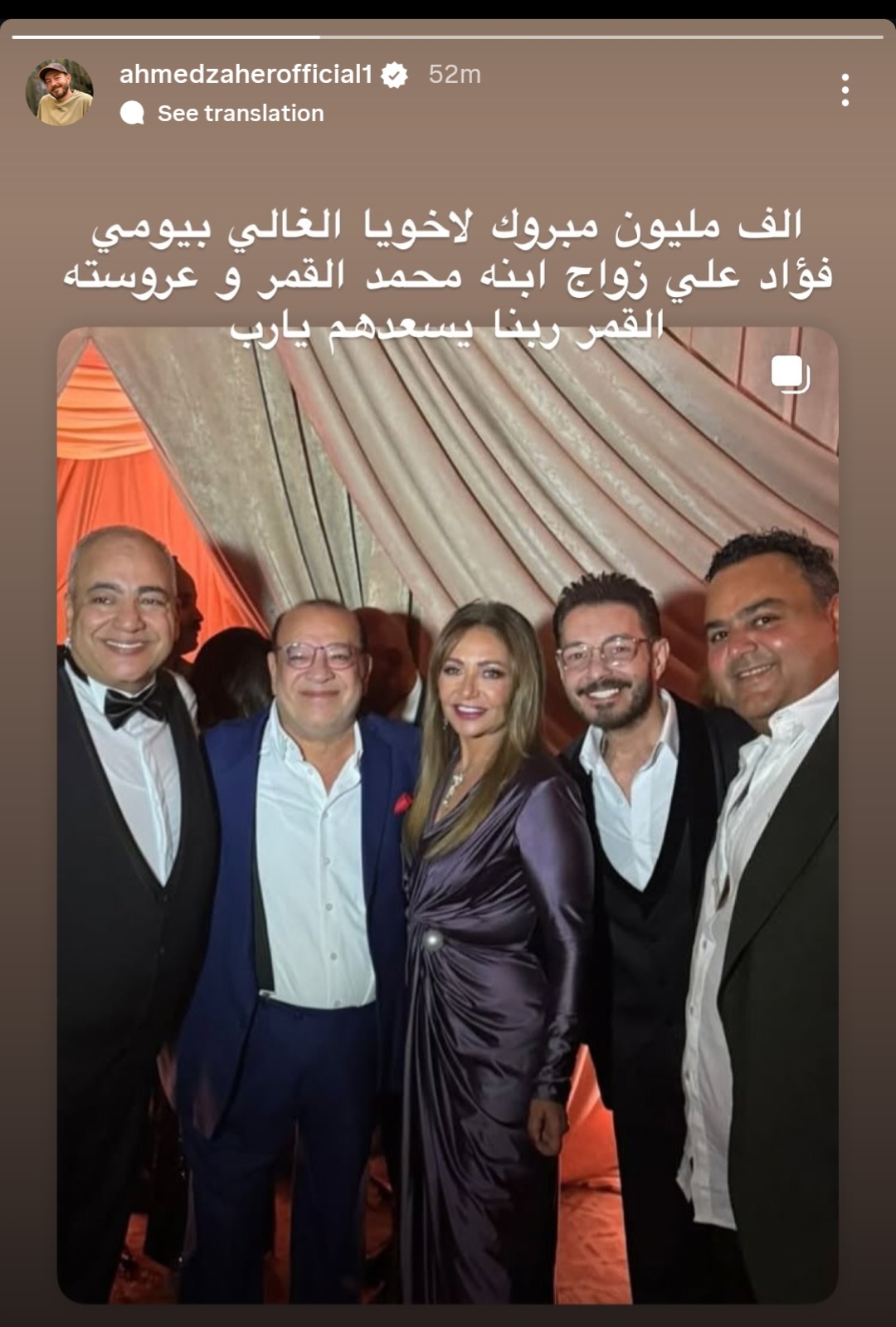 ونشر أحمد زاهر صورة تجمعه بـ بيومي فؤاد وعدد من النجوم أثناء حفل الزفاف، وذلك من خلال حسابه الرسمي عبر موقع تبادل الصور والفيديوهات القصيرة إنستجرام، عبر خاصية ستوري، وكتب: "ألف مليون مبروك لأخويا الغالي بيومي فؤاد على زواج ابنه محمد القمر وعروسته القمر ربنا يسعدهم يارب".