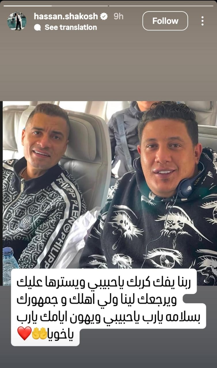 ونشر حسن شاكوش، صورة تجمعه بـ حمو بيكا عبرخاصية الاستوري على موقع “إنستجرام”، وكتب معلقًا:"ربنا يفك كربك يا حبيبي ويسترها عليك، ويرجعلك لينا ولأهلك ولجمهورك بالسلامة، ربنا يهون أيامك يا أخويا".