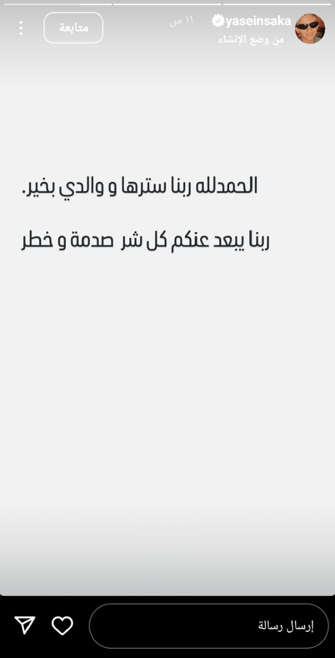 وكتب ياسين عبر حسابه الشخصي بموقع تبادل الصور والفيديوهات القصيرة"انسجرام"الحمدلله ربنا سترها ووالدي بخير، ربنا يبعد عنكم كل شر صدمة وخطر.