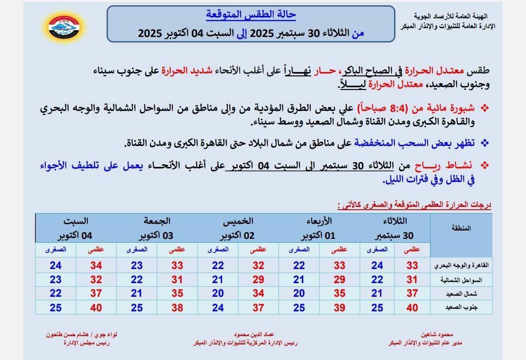 وأكدت الهيئة أن حالة الطقس المتوقعة من الثلاثاء 30 سبتمبر وحتى السبت 4 أكتوبر ستشهد استمرار نفس الأجواء الحارة نهارًا والمعتدلة ليلًا، مع استمرار نشاط الرياح والسحب المنخفضة التي تعمل على تلطيف الطقس في أغلب المحافظات.