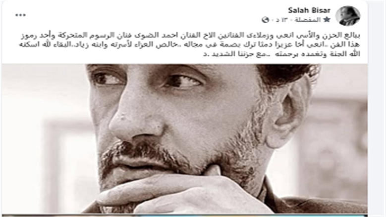 وأعلن الفنان التشكيلي صلاح بيصار، عبر صفحته الشخصية علي موقع التواصل الاجتماعي “فيسبوك”، عن وفاة الفنان أحمد الضوي.