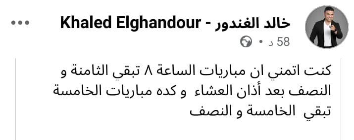 وكتب خالد الغندور عبر حسابه الشخصي"فيسبوك"كنت اتمني ان مباريات الساعة 8 تبقي الثامنة و النصف بعد أذان العشاء، وكده مباريات الخامسة تبقي الخامسة و النصف، كده افضل واللاعبين تصلي العشاء و تنزل تلعب".