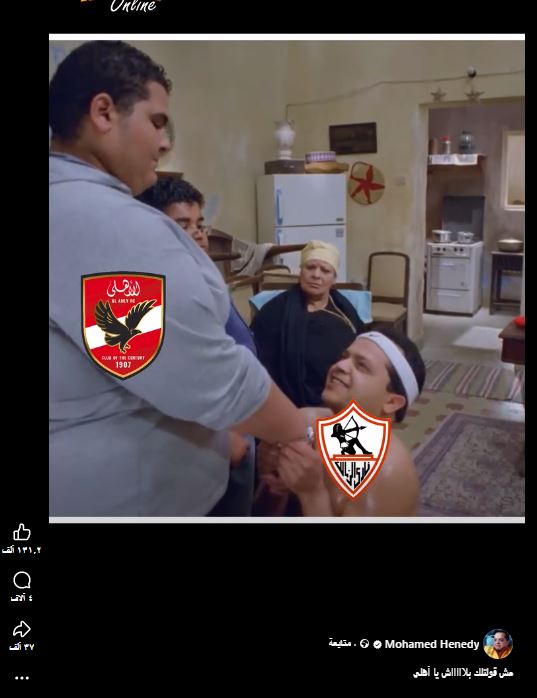 علق النجم محمد هنيدي بطريقة طريفة عقب فوز نادي الأهلي علي الزمالك بهدفين مقابل هدف ونشر مقطع فيديو من فيلمه "وش إجرام"، ووضع عليه شعار نادي الزمالك والنادي المصري والنادي الأهلي بطريقة ساخرة تعبر عن الهزيمة التي تلقاها نادي الزمالك أمس وعلق عليه " مش قولتلك بلاش يا أهلي ".