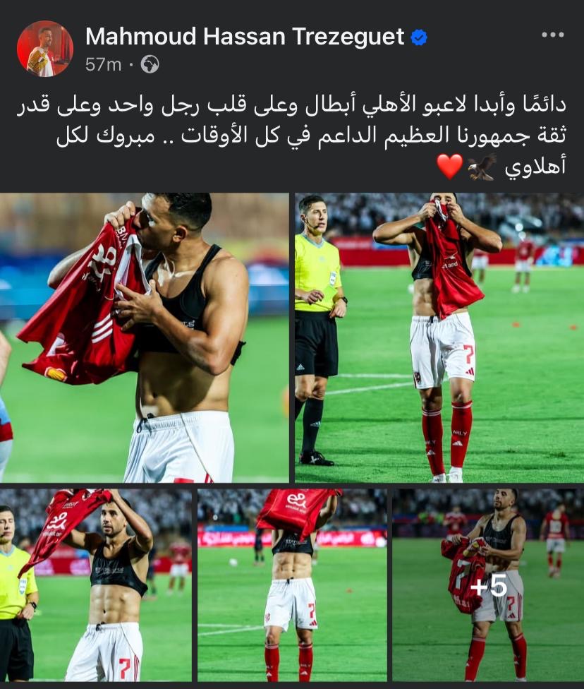 وكتب تريزيجيه عبر فيس بوك: "دائمًا وأبدا لاعبو الأهلى أبطال وعلى قلب رجل واحد وعلى قدر ثقة جمهورنا العظيم الداعم فى كل الأوقات.. مبروك لكل أهلاوى".