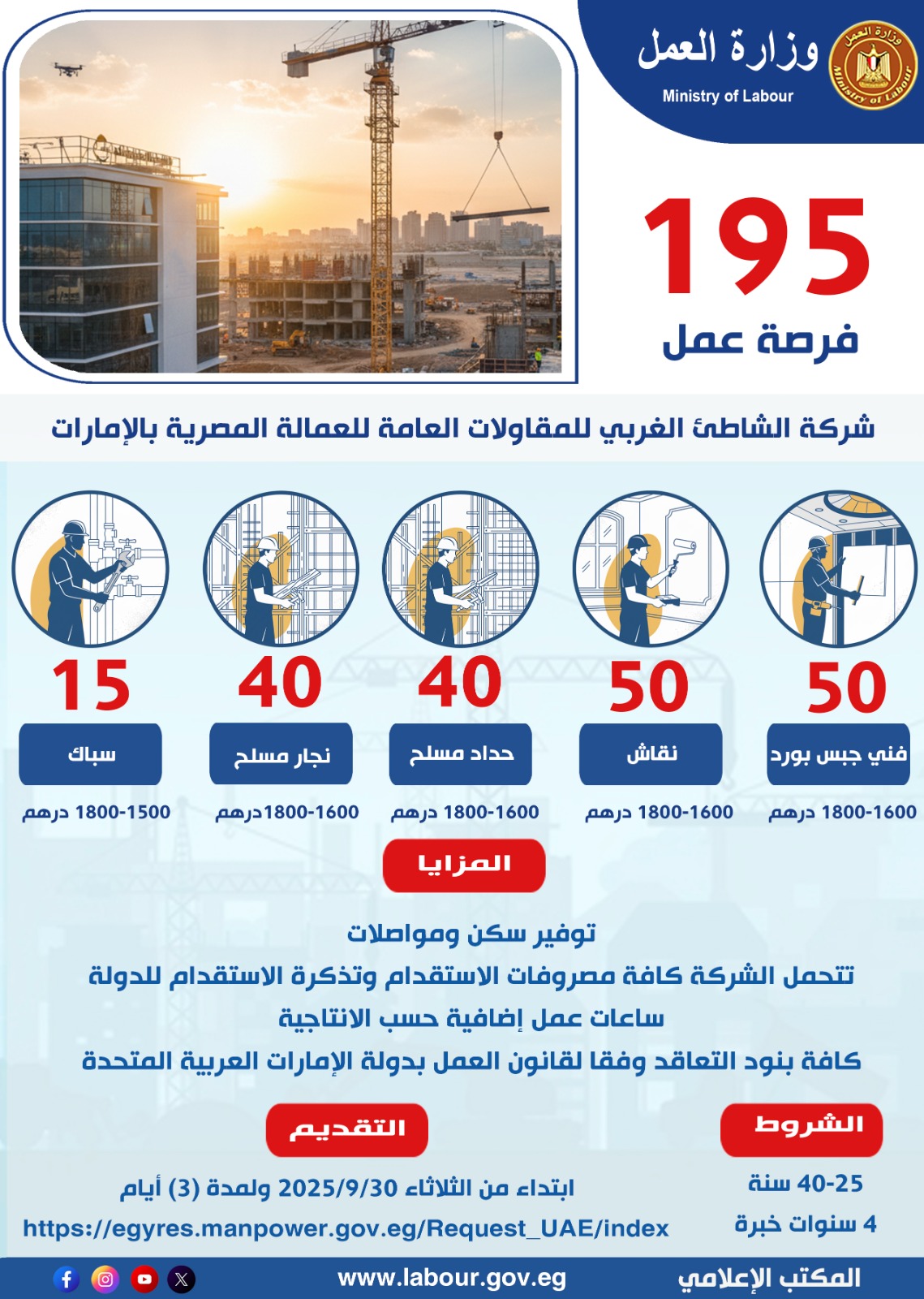 أعلنت وزارة العمل عن توفير 195 فرصة عمل جديدة بدولة الإمارات العربية المتحدة، لدى شركة "الشاطئ الغربي للمقاولات العامة"، في إطار جهود الوزارة لفتح أسواق عمل خارجية جديدة أمام العمالة المصرية، حيث وفر تلك الفرص مكتب التمثيل العمالي بالإمارات برئاسة السيدة /منال عبد العزيز.