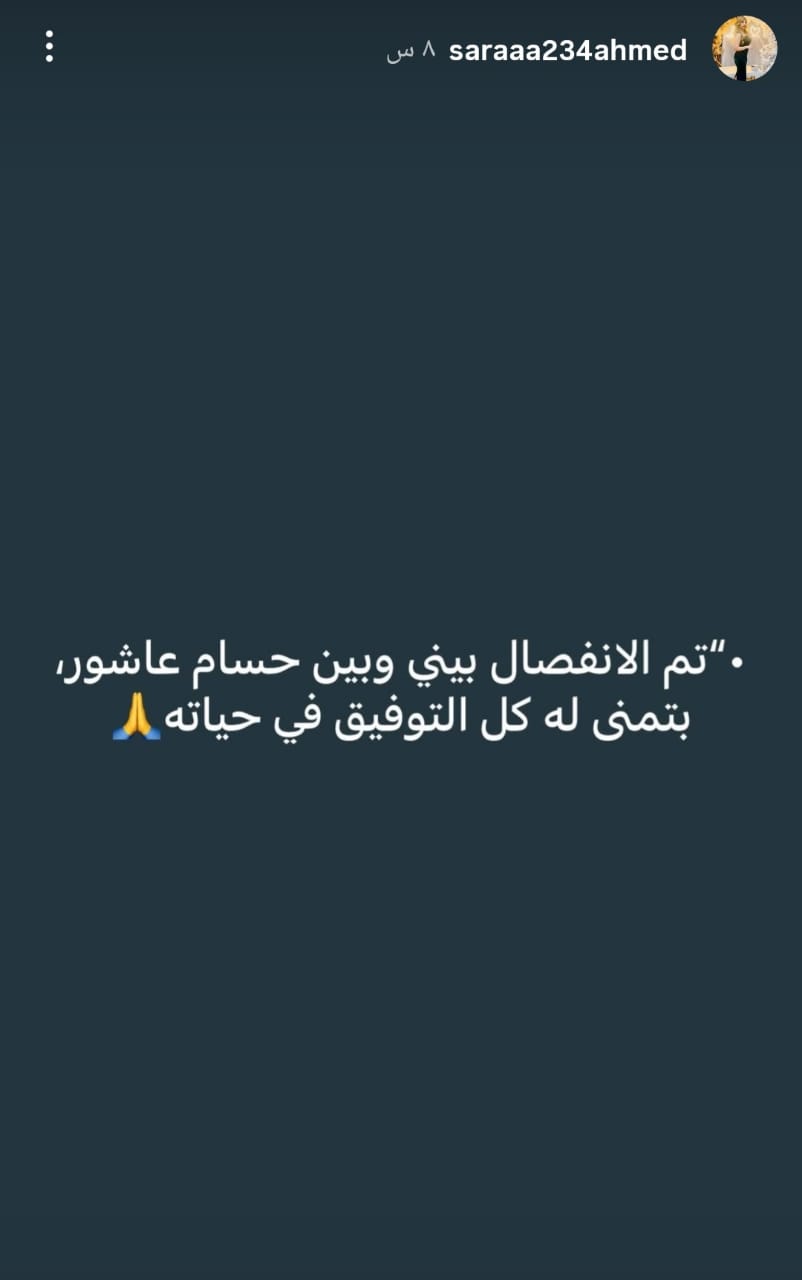 ونشرت سارة أحمد، ستوري عبر عبر خاصية الأستوري على تطبيق “واتساب”، وكتبت فيه: “تم الانفصال بيني وبين حسام عاشور.. بتمنى له كل التوفيق في حياته”.