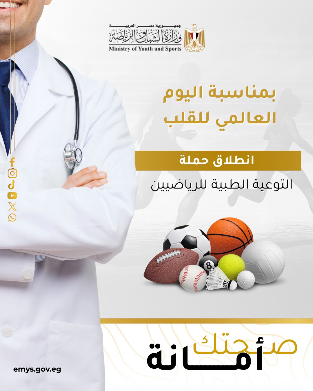 بمناسبة اليوم العالمي للقلب، أطلقت وزارة الشباب والرياضة بقيادة الدكتور أشرف صبحي، ممثلة في الإدارة المركزية للطب الرياضي، الحملة الطبية التوعوية "صحتك أمانة" والتي تنشر عبر الصفحات الرسمية على منصات التواصل الاجتماعي، في إطار استراتيجيتها الهادفة إلى نشر الوعي الصحي والرياضي بين مختلف الفئات، ونشر ثقافة الوقاية والحفاظ على اللياقة البدنية للرياضيين.