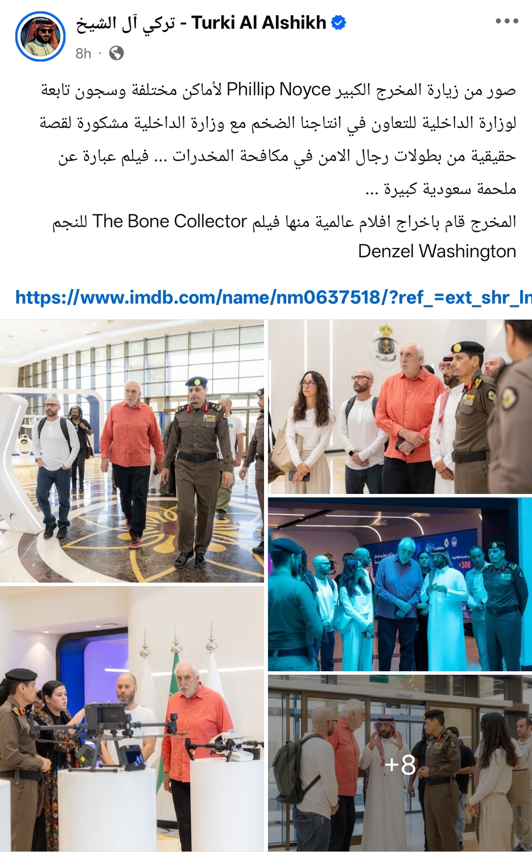 وكتب: "صور من زيارة المخرج الكبير Phillip Noyce لأماكن مختلفة وسجون تابعة لوزارة الداخلية للتعاون في انتاجنا الضخم مع وزارة الداخلية مشكورة لقصة حقيقية من بطولات رجال الامن في مكافحة المخدرات ، فيلم عبارة عن ملحمة سعودية كبيرة، المخرج قام باخراج افلام عالمية منها فيلم The Bone Collector للنجم Denzel Washington".