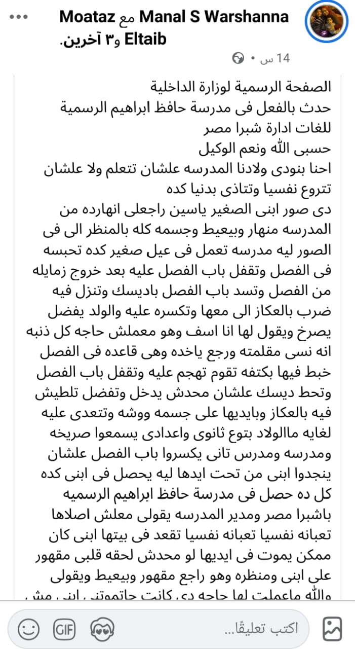 وكتبت ولية أمر الطفل ياسين عبر صفحتها الشخصية"فيسبوك"حسبى الله ونعم الوكيل، احنا بنودى ولادنا المدرسه علشان تتعلم ولا علشان تتروع نفسيا وتتاذى بدنيا كده .