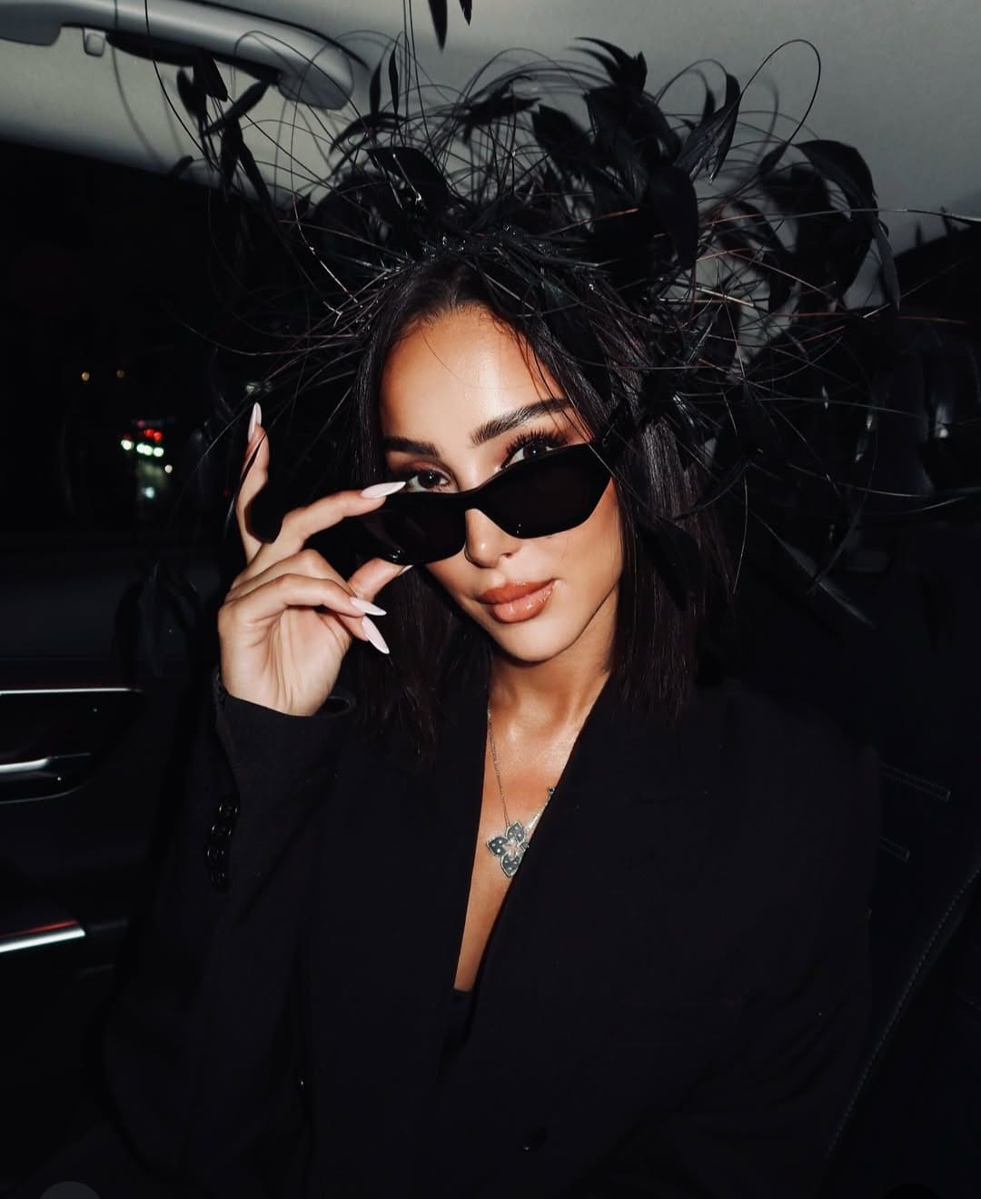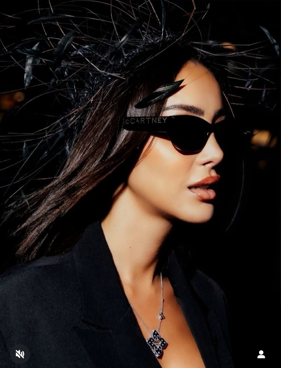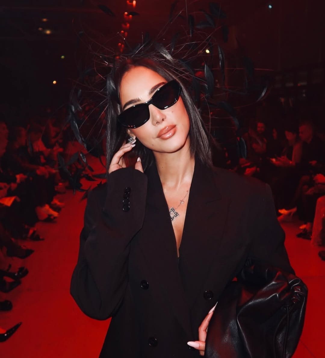 وخطفت حسناء الغناء بسمة بوسيل الأنظار بإطلالتها الأنيقة حيث ارتدت بدلة سوداء كلاسيكية عكست حضورا قويا ولمسة من الفخامة، ونسقتها مع نظارة شمسية سوداء كبيرة منحتها مظهرا غامضا وجريئا، وزادت الإطلالة تميزا بإكسسوار رأس فاخر يزينه الريش الأسود، في لمسة درامية توحي بأجواء عروض الأزياء الراقية، أما القلادة البسيطة فكانت كافية لتضيف لمسة أنثوية رقيقة، في حين جاء المكياج البرونزي البراق وتسريحة الشعر المنسدلة ليكملا المظهر بكامل الأناقة والثقة.