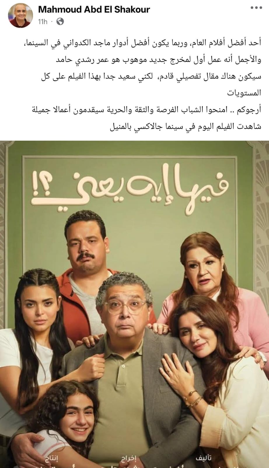 أضاف:"أرجوكم .. امنحوا الشباب الفرصة والثقة والحرية سيقدمون أعمالا جميلة.. شاهدت الفيلم اليوم في سينما جالاكسي بالمنيل".
