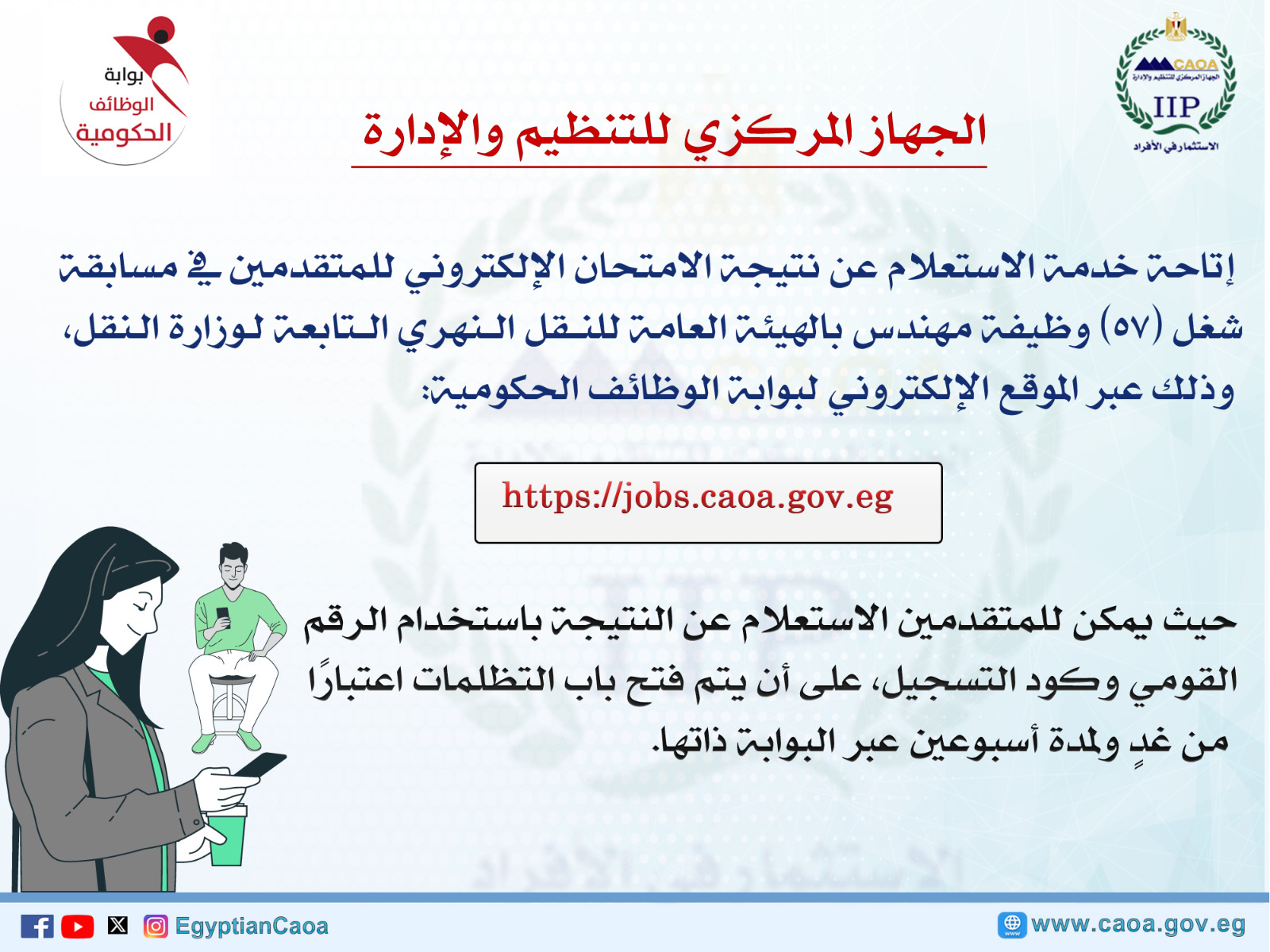 أعلن الجهاز المركزي للتنظيم والإدارة، برئاسة المهندس حاتم نبيل، عن نتيجة الامتحان الإلكتروني للمتقدمين في مسابقة شغل (٥٧) وظيفة مهندس بالهيئة العامة للنقل النهري التابعة لوزارة النقل، وذلك عبر الموقع الإلكتروني لبوابة الوظائف الحكومية: