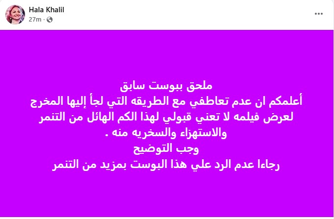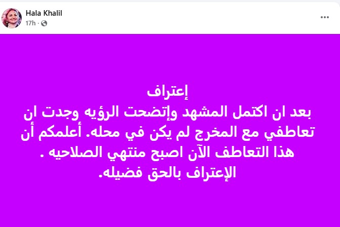 وكتبت هالة خليل من خلال حسابها الرسمي عبر موقع التواصل الاجتماعي "فيسبوك": "إعتراف.. بعد ان اكتمل المشهد وإتضحت الرؤيه وجدت ان تعاطفي مع المخرج لم يكن في محله. أعلمكم أن هذا التعاطف الآن اصبح منتهي الصلاحيه .