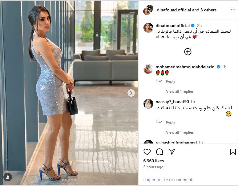 وشاركت دينا فؤاد جمهورها صور من أحدث جلسة تصوير لها، والتي ظهرت فيها بفستان جرئ وقصير وعاري الكتفين، والذي أثار إعجاب بعض متابعيها، والبعض الآخر وجه لها انتقاد، حيث قالت إحدى المتابعين له:"لبسك كان حلو ومحتشم يا دينا ليه كده؟".