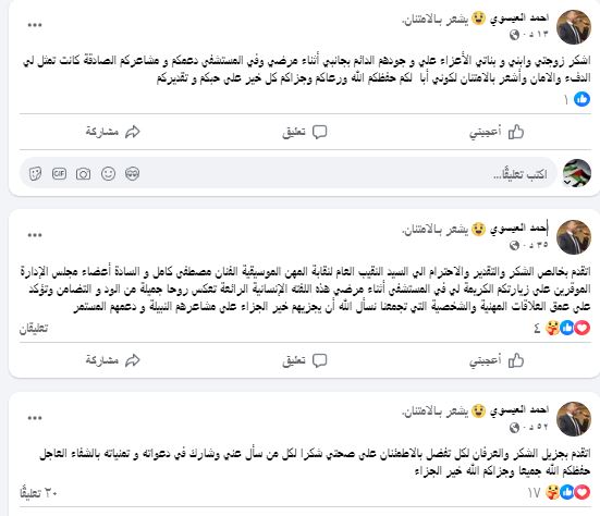 وكتب العيسوي عبر صفحته الرسمية "فيس بوك"" أشكر زوجتي وابني وبناتي الأعزاء على و جودهم الدائم بجانبي أثناء مرضي وفي المستشفى دعمكم و مشاعركم الصادقة كانت تمثل لي الدفء والامان وأشعر بالامتنان لكوني أبا لكم حفظكم الله ورعاكم وجزاكم كل خير على حبكم وتقديركم".
