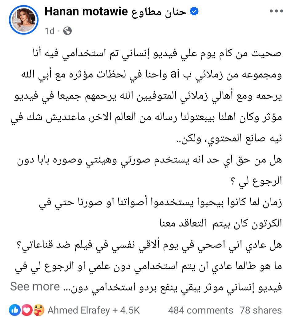 وأعرب عن تصرفه"انا غلطت إني ما استأذنتش من أي فنان أو من أهاليهم قبل ما أنزل الفيديو، بمنتهى الأمانة مكنتش متوقع خالص إن ده يكون رد الفعل، بالعكس كنت فاكر إن الكل هيبقى مبسوط إننا بنحيي ذكرى ناس كلنا بنحبهم. بس زي ما النجمة حنان مطاوع قالت: حتى لو النية كويسة، الفكرة ممكن تفتح أبواب لناس نيتهم مش كويسة يستغلوا الفنانين بشكل وحش".