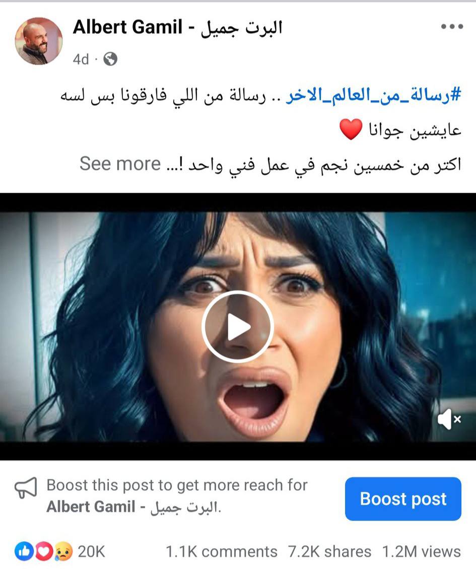 وأختتم حديثه"والحقيقة اللي شجعتني اعمل الفيديو هو إن الفترة اللي فاتت انتشرت صور كتير معمولة بالـ AI لفنانين بيتصوّروا وكأنهم بيحضنوا أحبابهم اللي توفوا، وشفنا فنانين نفسهم بيشيروا الصور دي ومبسوطين بيها. انا بس حاولت أطور الفكرة دي في شكل درامي متحرك برسالة هادفة ومؤثرة".