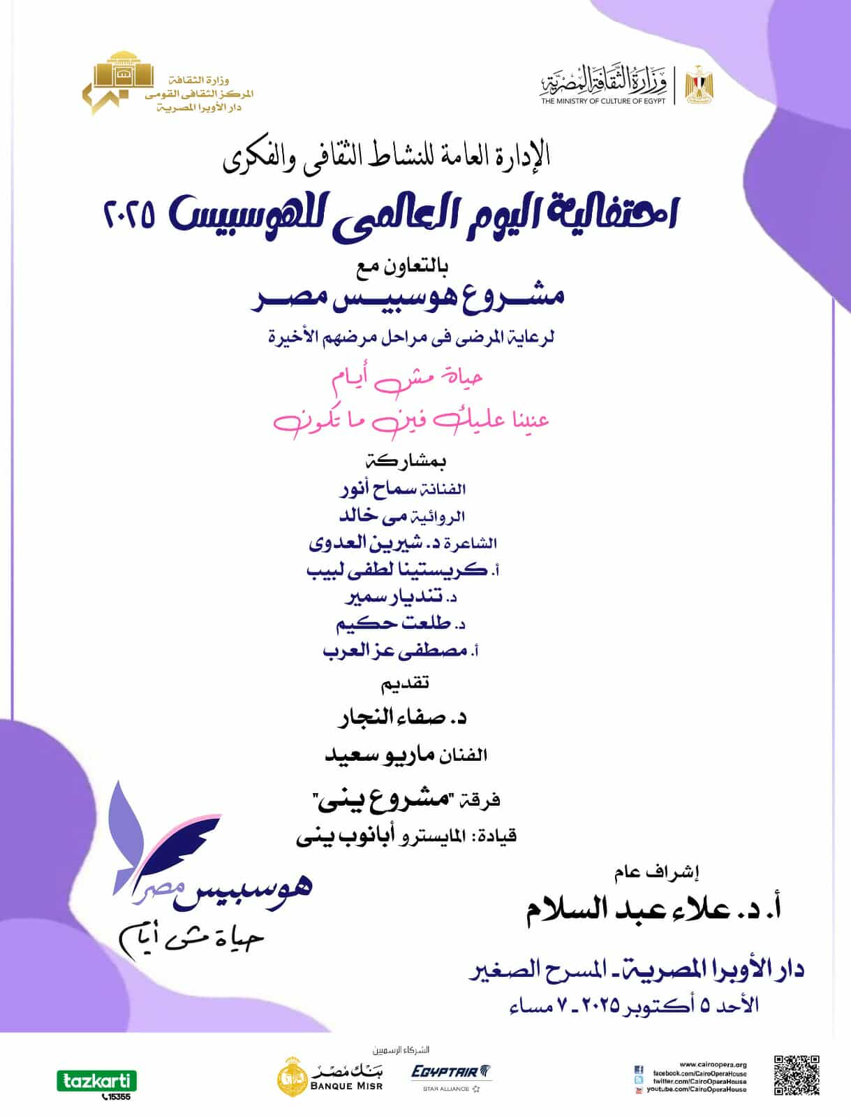تعقد دار الأوبرا المصرية، برئاسة الدكتور علاء عبد السلام، ندوة ثقافية بمناسبة اليوم العالمي لذوي الأمراض المزمنة “الهوسبيس”، وتحمل عنوان "حياة مش أيام .. عنينا عليك فين ما تكون"، ضمن فعاليات نشاطها الثقافي والفكري بإشراف رشا الفقي، بالتعاون مع مشروع هوسبيس مصر، وذلك فى السابعة مساء الأحد 5 أكتوبر بالمسرح الصغير بالاوبرا.