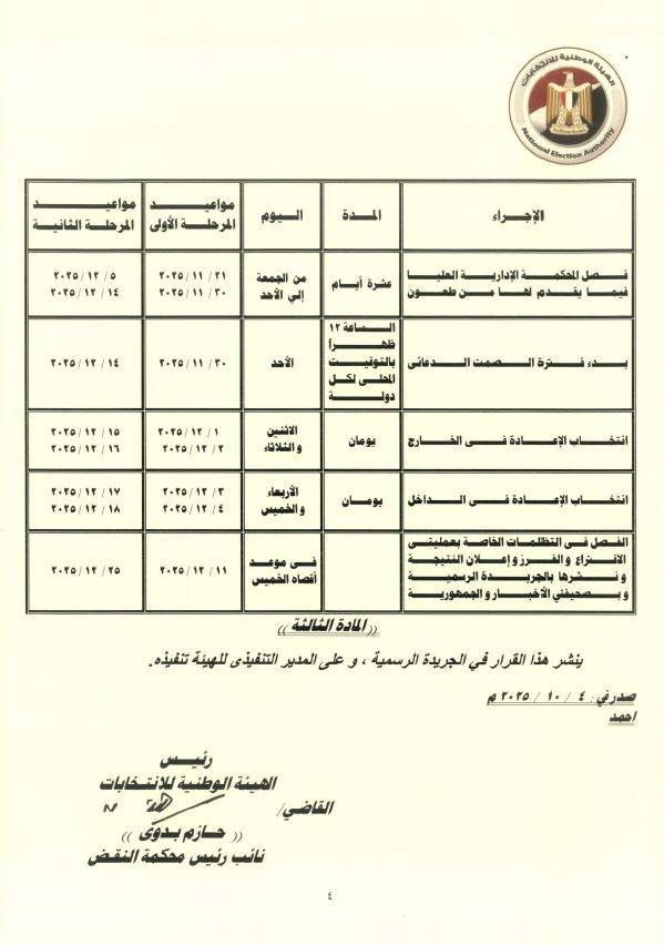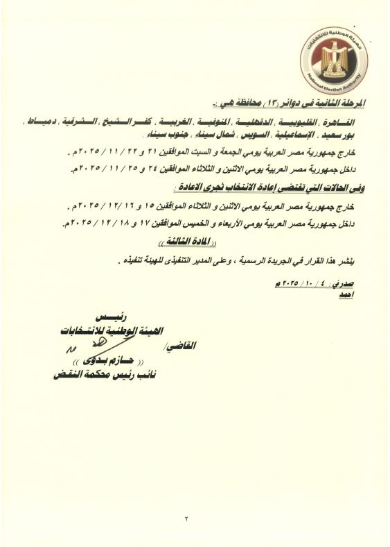 وقّع القرار كل من أحمد القاضي، رئيس الهيئة الوطنية للانتخابات، وحازم بدوي، نائب رئيس محكمة النقض.