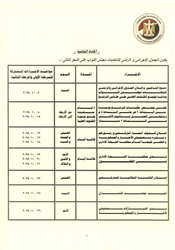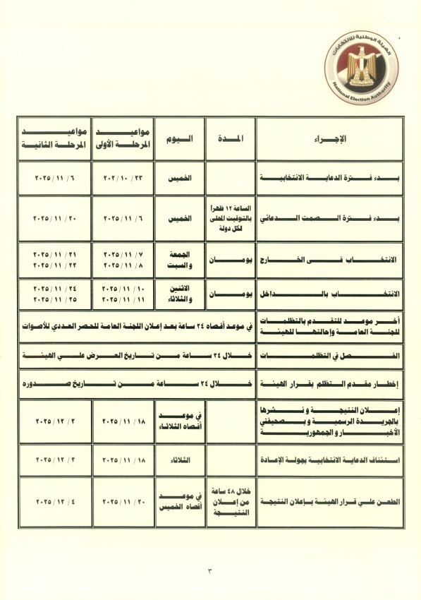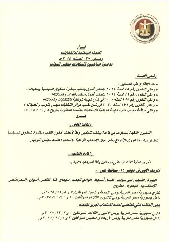 ووفق القرار الصادر في 4 أكتوبر، يُدعى الناخبون المسجّلون في قاعدة بيانات الناخبين للمشاركة في الاقتراع على مرحلتين، داخل وخارج الجمهورية، مع تحديد مواعيد إعادة الانتخاب في حال اقتضت الحاجة.