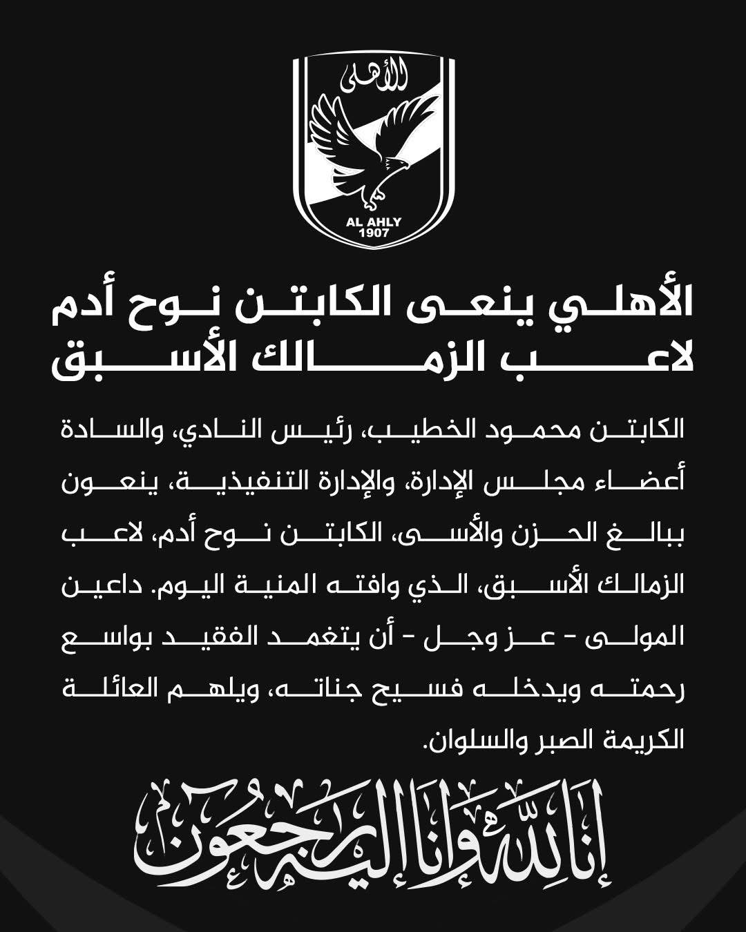 قدّم نادي الأهلي برئاسة الكباتن محمود الخطيب، نعي عبر حسابه الرسمي على فيسبوك، الكابتن نوح اأدم نجم نادي الزمالك السابق الذي وافته المنية اليوم.