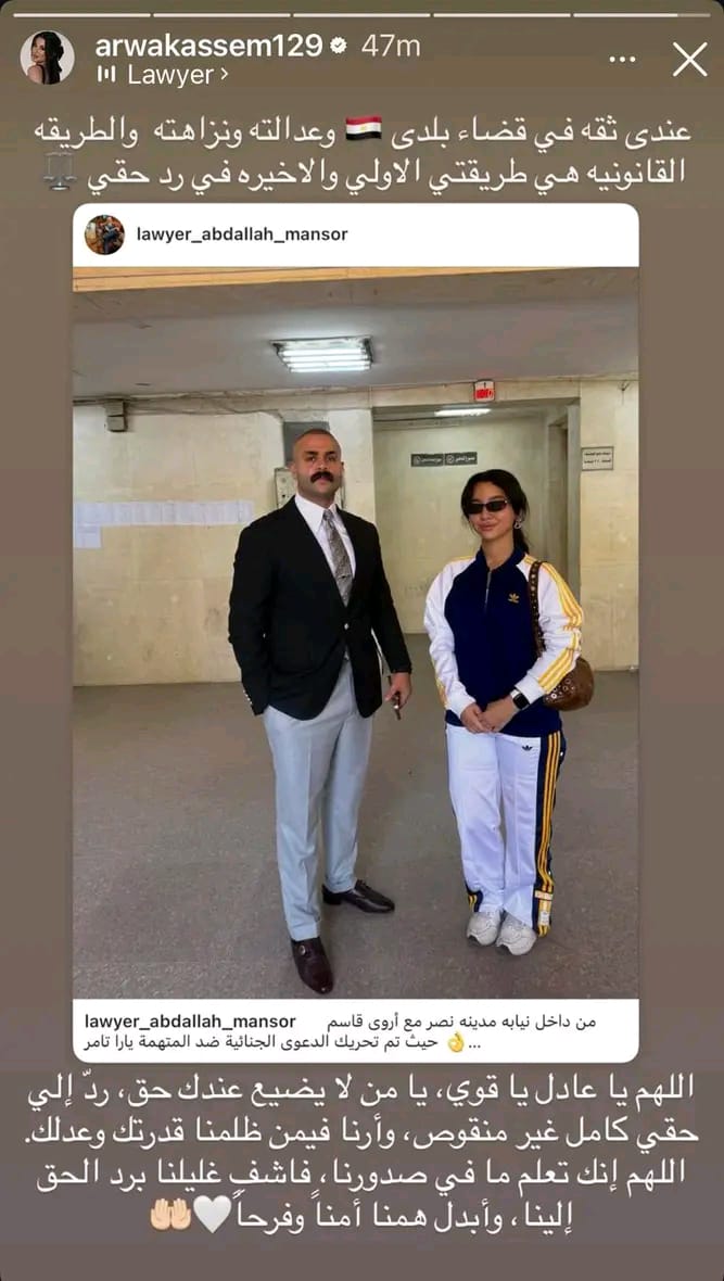 وكتبت البلوجر أروى قاسم عبر موقع تبادل الصور والفيديوهات القصيرة"انسجرام"، قائلة: عندي ثقة في قضاء بلدي وعدالته ونزاهته والطرق القانونية هي طريقي الأول والأخير في رد حقي".
