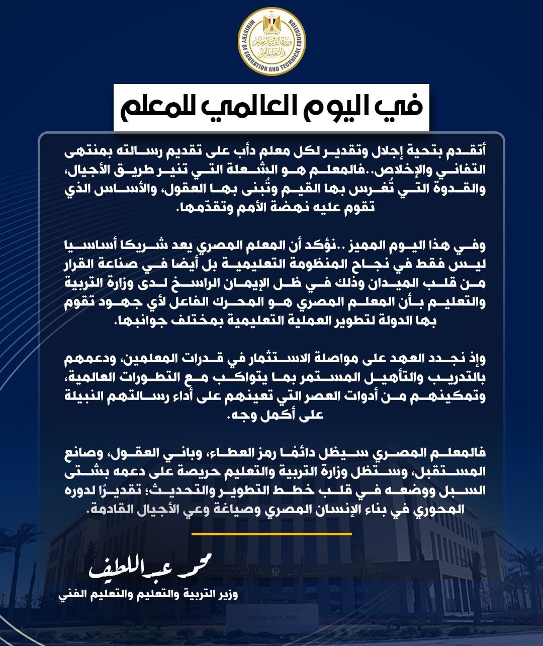 رسالة هامة من وزير التربية والتعليم في اليوم العالمي للمعلم