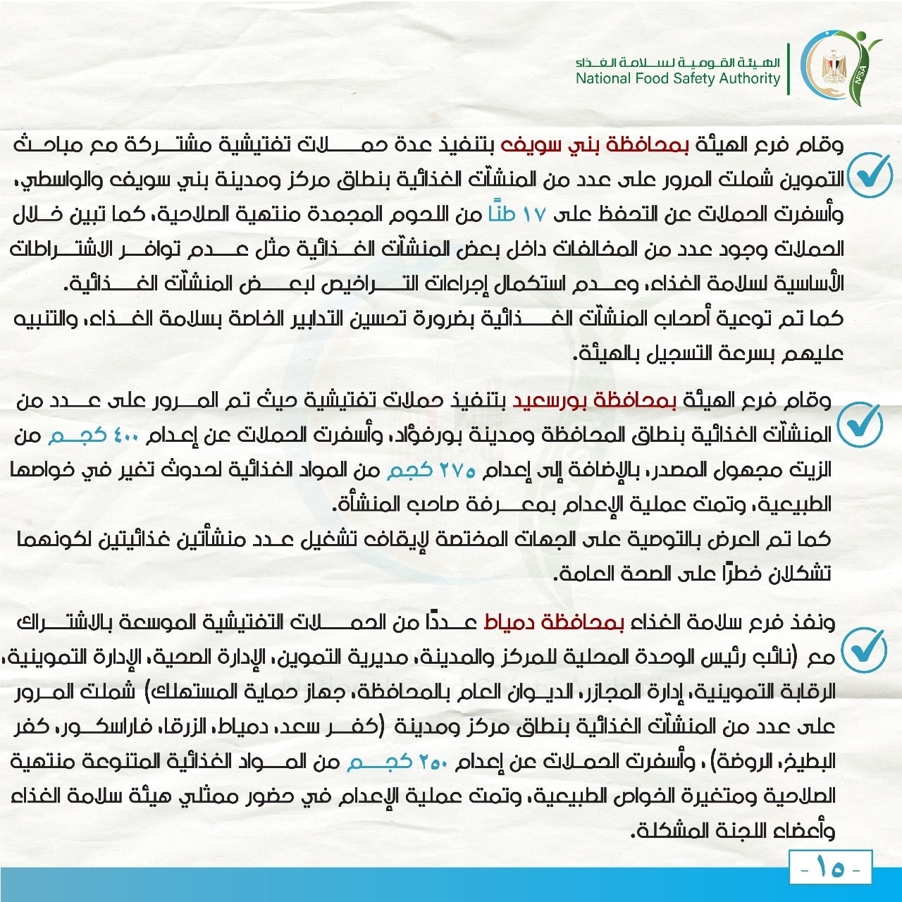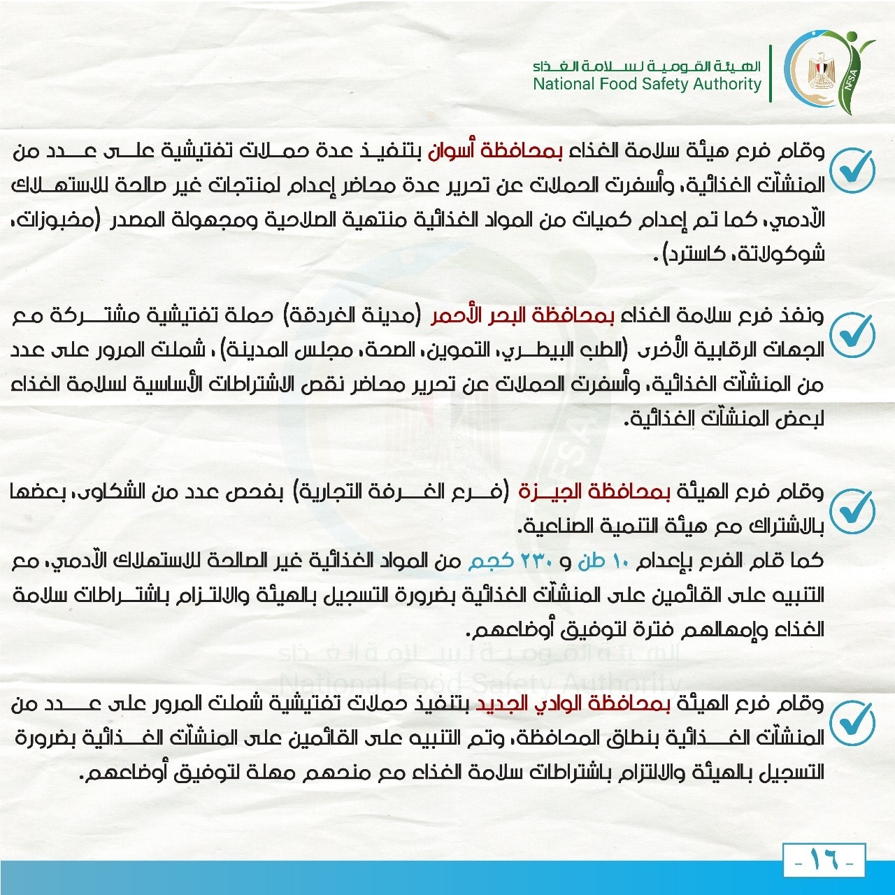 وقام فرع هيئة سلامة الغذاء بمحافظة أسوان بتنفيذ عدة حملات تفتيشية على عدد من المنشآت الغذائية، وأسفرت الحملات عن تحرير عدة محاضر إعدام لمنتجات غير صالحة للاستهلاك الآدمي، كما تم إعدام كميات من المواد الغذائية منتهية الصلاحية ومجهولة المصدر (مخبوزات، شوكولاتة، كاسترد).