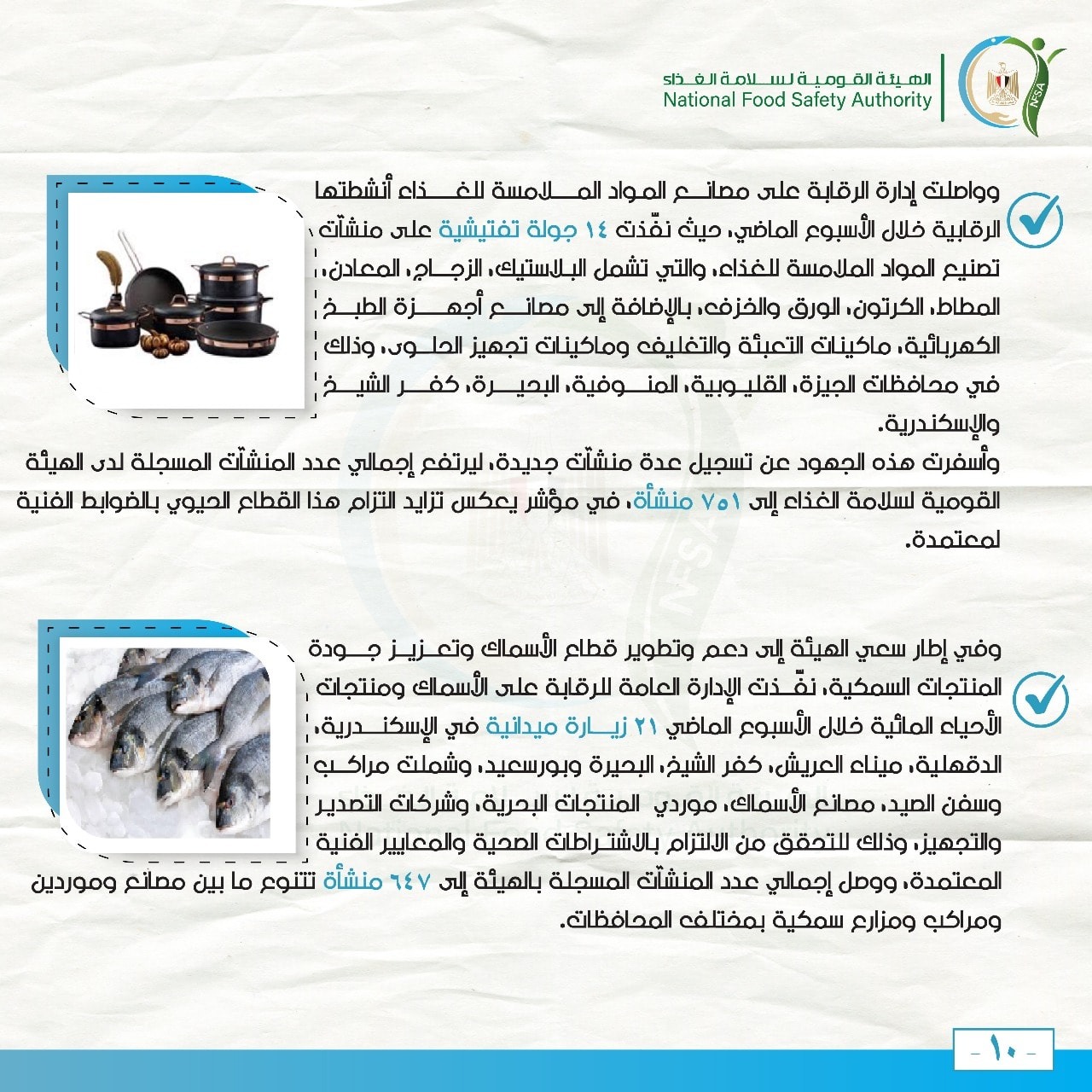 وفي إطار سعي الهيئة إلى دعم وتطوير قطاع الأسماك وتعزيز جودة المنتجات السمكية، نفّذت الإدارة العامة للرقابة على الأسماك ومنتجات الأحياء المائية خلال الأسبوع الماضي 21 زيارة ميدانية في الإسكندرية، الدقهلية، ميناء العريش، كفر الشيخ، البحيرة وبورسعيد، وشملت مراكب وسفن الصيد، مصانع الأسماك، موردي المنتجات البحرية، وشركات التصدير والتجهيز، وذلك للتحقق من الالتزام بالاشتراطات الصحية والمعايير الفنية المعتمدة، ووصل إجمالي عدد المنشآت المسجلة بالهيئة إلى 647 منشأة تتنوع ما بين مصانع وموردين ومراكب ومزارع سمكية بمختلف المحافظات.