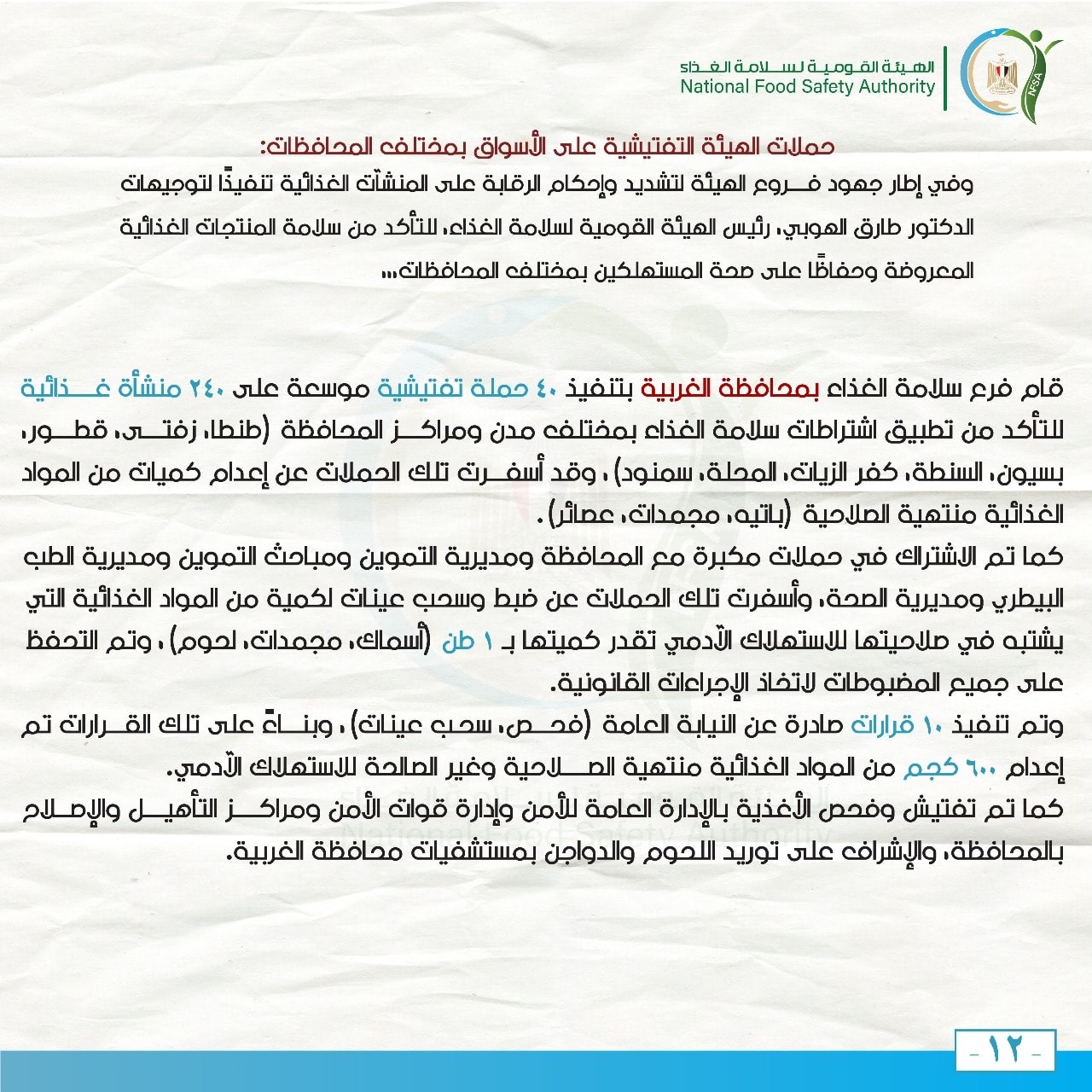 وفي إطار جهود فروع الهيئة لتشديد وإحكام الرقابة على المنشآت الغذائية تنفيذًا لتوجيهات الدكتور طارق الهوبي، رئيس الهيئة القومية لسلامة الغذاء، للتأكد من سلامة المنتجات الغذائية المعروضة وحفاظًا على صحة المستهلكين بمختلف المحافظات،قام فرع سلامة الغذاء بمحافظة الغربية بتنفيذ 40 حملة تفتيشية موسعة على 240 منشأة غذائية للتأكد من تطبيق اشتراطات سلامة الغذاء بمختلف مدن ومراكز المحافظة (طنطا، زفتى، قطور، بسيون، السنطة، كفر الزيات، المحلة، سمنود)، وقد أسفرت تلك الحملات عن إعدام كميات من المواد الغذائية منتهية الصلاحية (باتيه، مجمدات، عصائر).