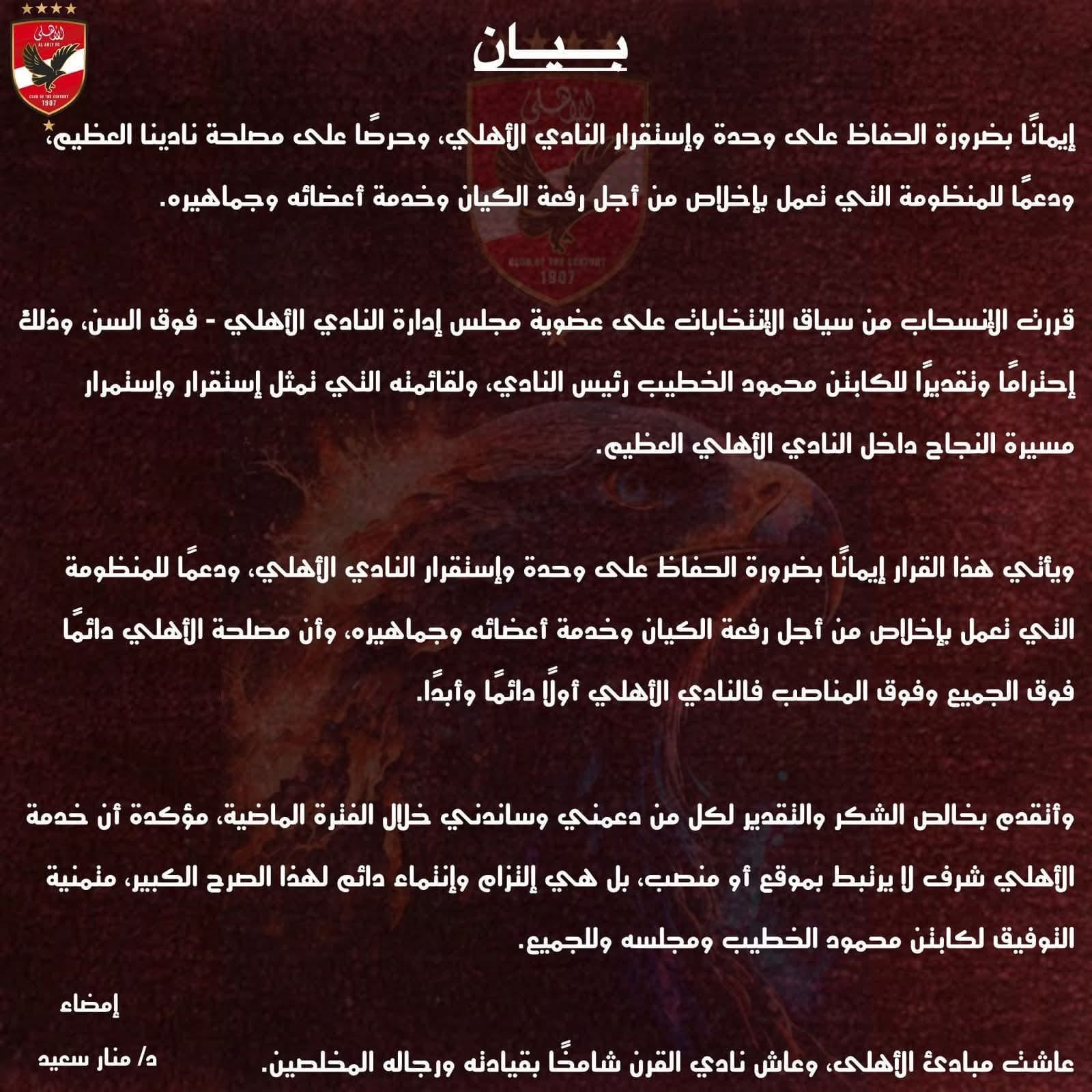 ونشرت منار السعيد بياناً رسمياً عبر صفحتها قالت فيه: "إيمانًا بضرورة الحفاظ على وحدة وإستقرار النادي الأهلي، وحرصًا على مصلحة نادينا العظيم ودعما للمنظومة التي تعمل بإخلاص من أجل رفعة الكيان وخدمة أعضائه وجماهيره.. قررت الانسحاب من سياق الانتخابات على عضوية مجلس إدارة النادي الأهلي - فوق السن، وذلك احترامًا وتقديرا للكابتن محمود الخطيب رئيس النادي، ولقائمته التي تمثل إستقرار واستمرار مسيرة النجاح داخل النادي الأهلي العظيم