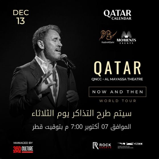 يستعد النجم العراقي كاظم الساهر لإحياء حفل غنائي ضخم، من المقرر إقامته 13 ديسمبر المقبل في الدوحة ضمن جولته العالمية Now and Then!" ومن المتوقع أن يقدم كاظم الساهر مجموعة من أغانيه الجديدة والقديمة التي يتفاعل معها الجمهور ومنها علمني حبك سيدتي، كلك على بعضك، المستبدة، قولي أحبك، أنا وليلى".
