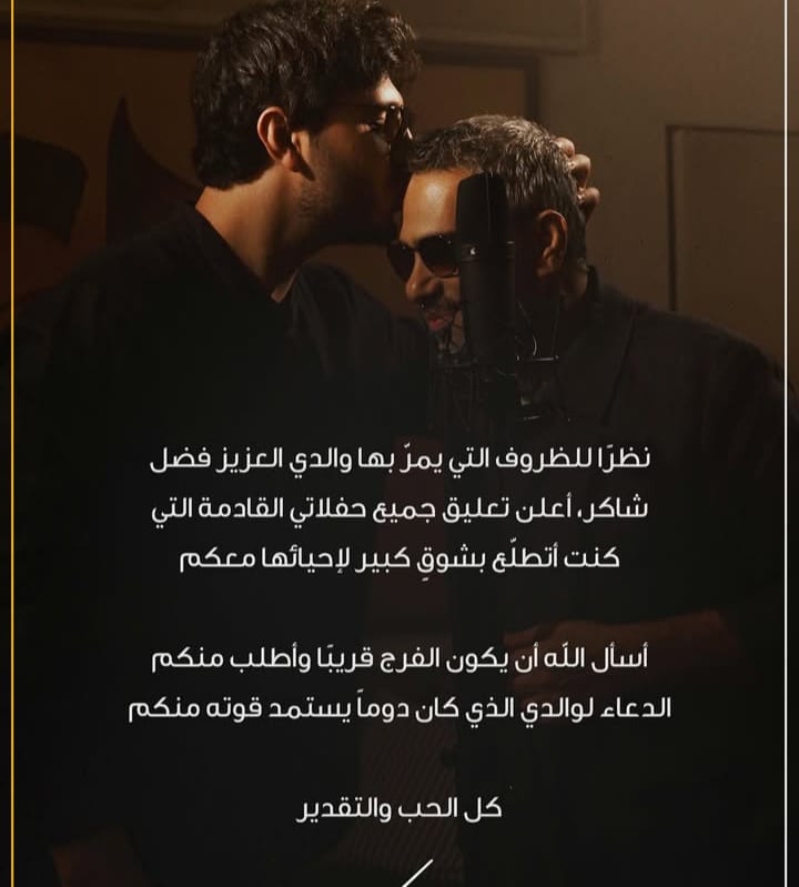 وكتب محمد فضل شاكر عبر حسابه الشخصي بموقع تبادل الصور والفيديوهات القصيرة"انسجرام"قائلا:نظرا للظروف التي يمر بها والدي العزيز فضل شاكر، أعلن تعليق جميع حفلاتي القادمة التي كنت أتطلع بشوق كبير لإحيائها معكم.. أسأل الله أن يكون الفرج قريبا وأطلب منكم الدعاء لوالدي الذي كان دوماً يستمد قوته منكم.. كل الحب والتقدير".