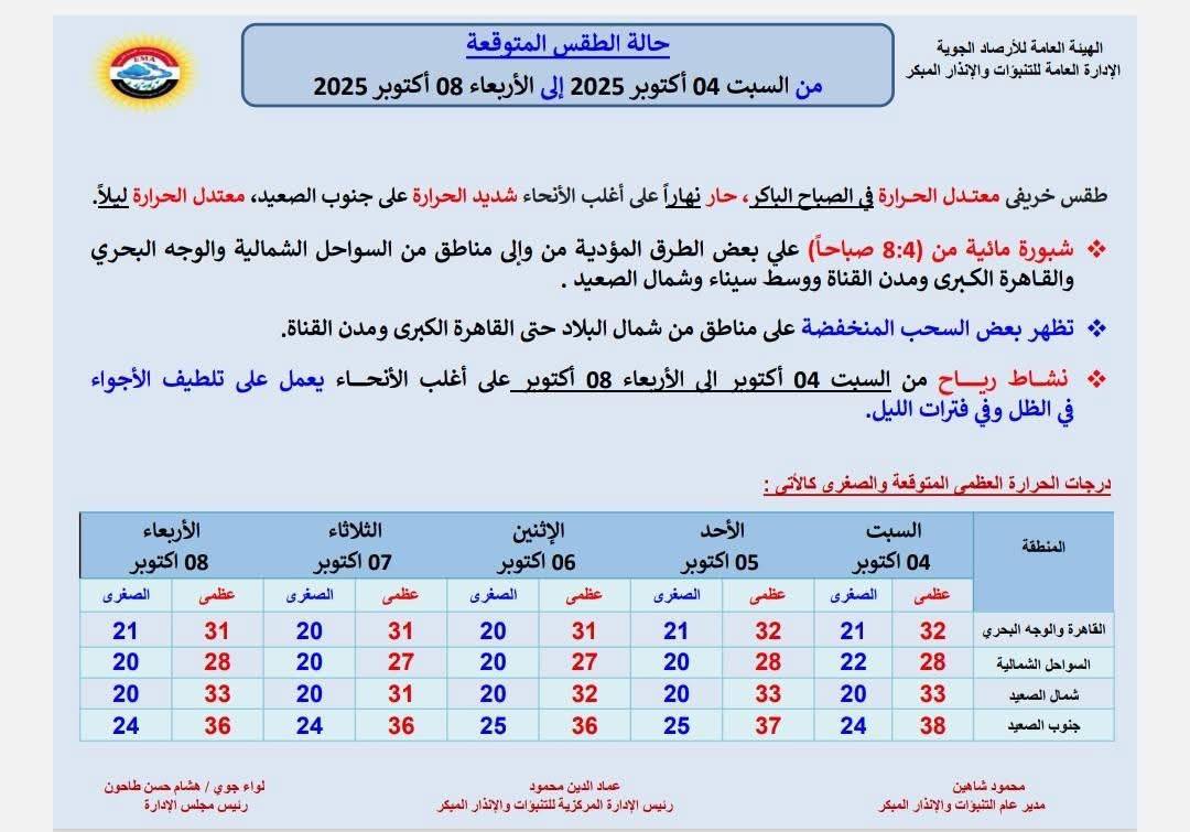 يرصد لكم موقع مصر تايمز تفاصيل توقعات هيئة الأرصاد الجوية بشأن حالة الطقس غدًا الأربعاء 8 أكتوبر 2025، وفقًا للتقرير الصادر عن الهيئة العامة للأرصاد الجوية.