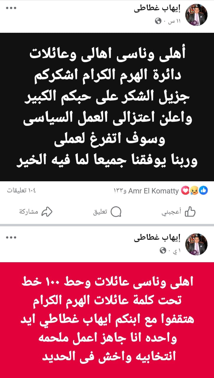 وكان إيهاب غطاطي أعلن أول أمس عزمه الترشح لانتخابات مجلس النواب 2025 عن دائرة الهرم، وكتب عبر صفحته الرسمية على "فيسبوك": "أهلي وناسى عائلات وحط 100 خط تحت كلمة عائلات الهرم الكرام هتقفوا مع ابنكم ايهاب غطاطي إيد واحدة أنا جاهز أعمل ملحمة انتخابية واخش فى الحديد".