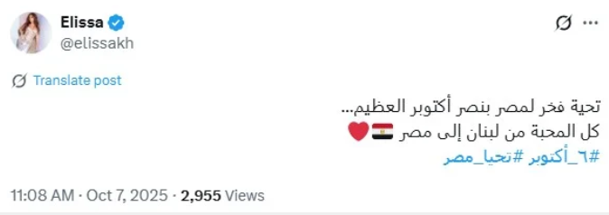 نشرت إليسا، تغريدة عبر حسابها الرسمي على منصة X، قائلة: “تحية فخر لمصر بنصر أكتوبر العظيم، كل المحبة من لبنان إلى مصر”.، والرسالة لاقت تفاعلًا واسعًا من متابعيها في الوطن العربي، خاصة لما تحمله من مشاعر صادقة تجاه مصر وشعبها.