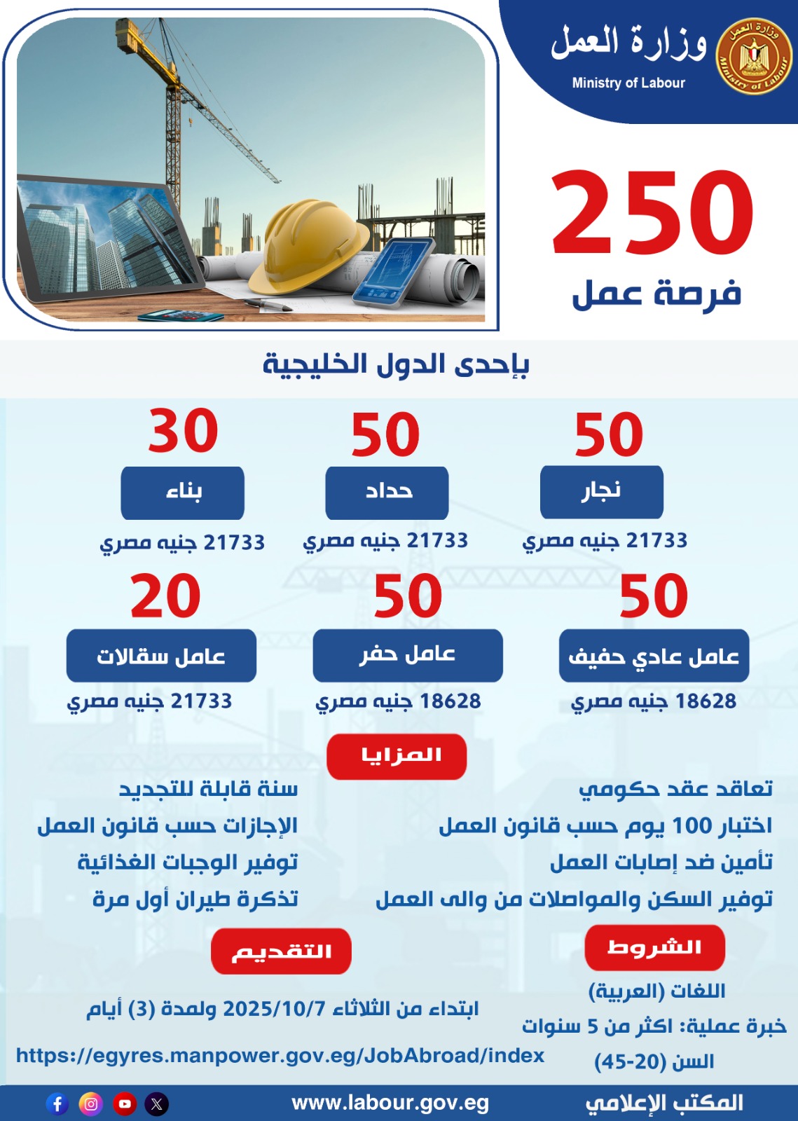 أعلن وزير العمل محمد جبران، اليوم الثلاثاء، عن فتح باب التقديم لـ 250 فرصة عمل جديدة للعمالة المصرية بإحدى الدول الخليجية، في عدد من المهن الفنية، تشمل: (50 نجار – 50 حداد – 30 بناء – 20 عامل سقالات – 50 عامل حفر – 50 عامل عادي خفيف)، برواتب تتراوح ما بين ما يعادل 18 ألف و628 جنيهًا مصريا إلى 21 ألف و733 جنيهًا مصريًا شهريًا.