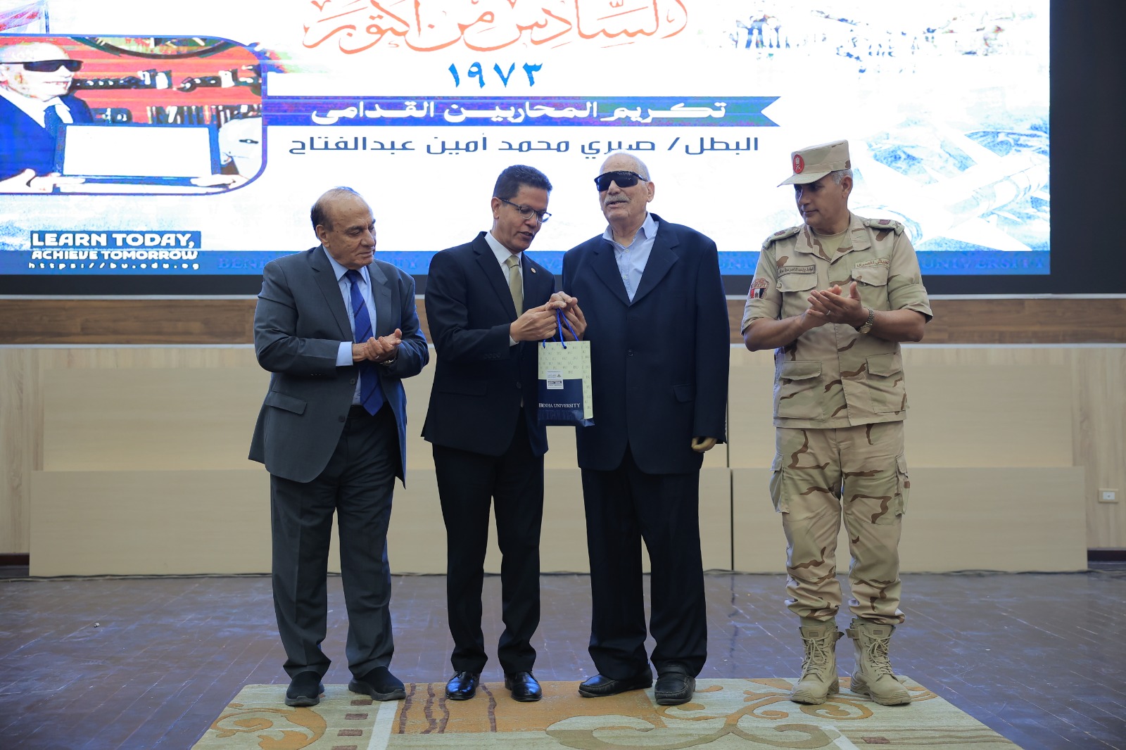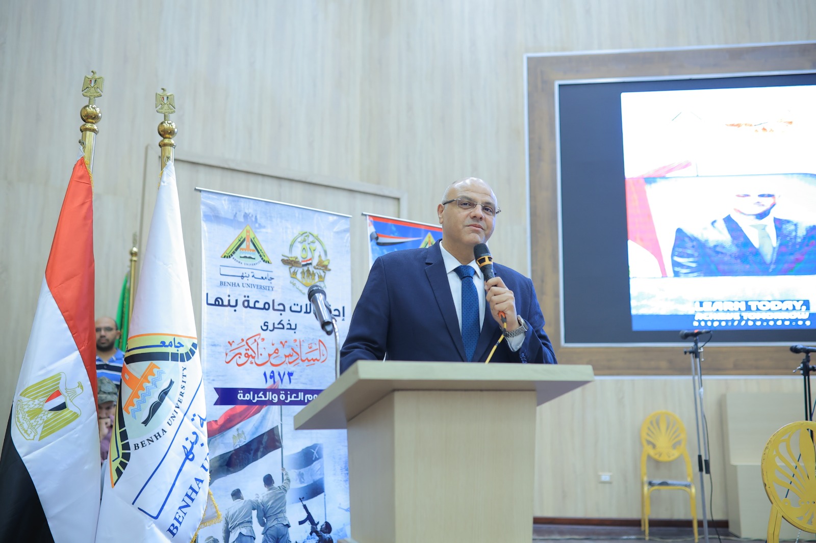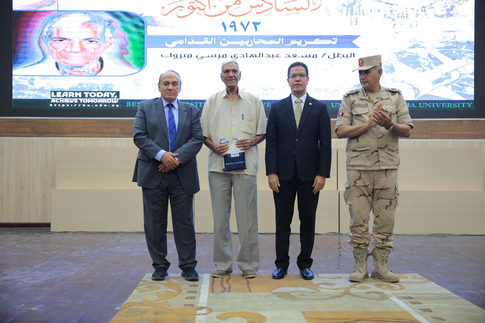شهد المهندس أيمن عطيه محافظ القليوبية ، والدكتور ناصر الجيزاوي رئيس جامعة بنها ، واللواء أركان حرب الدكتور سمير فرج مدير إدارة الشئون المعنوية الأسبق والخبير الاستراتيجي العسكري، الندوة التثقيفية التى نظمتها جامعة بنها بمناسبة مرور 52 عاما على ذكرى انتصارات حرب السادس من اكتوبر ١٩٧٣ م بعنوان " يوم العزة والكرامة ".