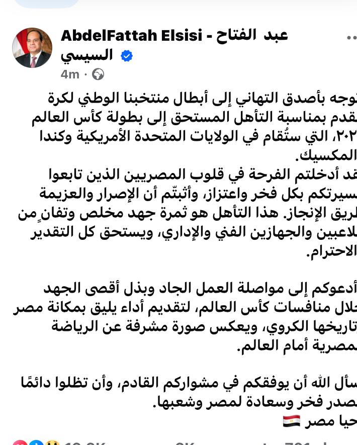 وتابع "وأدعوكم إلى مواصلة العمل الجاد وبذل أقصى الجهد خلال منافسات كأس العالم، لتقديم أداء يليق بمكانة مصر وتاريخها الكروي، ويعكس صورة مشرفة عن الرياضة المصرية أمام العالم.. أسأل الله أن يوفقكم في مشواركم القادم، وأن تظلوا دائمًا مصدر فخر وسعادة لمصر وشعبها.. تحيا مصر ".
