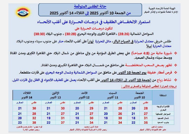 وفي سياق حالة الطقس غدا الجمعة 10 أكتوبر، أعلنت الهيئة عن فرص سقوط أمطار خفيفة على بعض مناطق السواحل الشمالية وشمال الوجه البحري، تكون على فترات متقطعة دون تأثير كبير على الأنشطة اليومية.